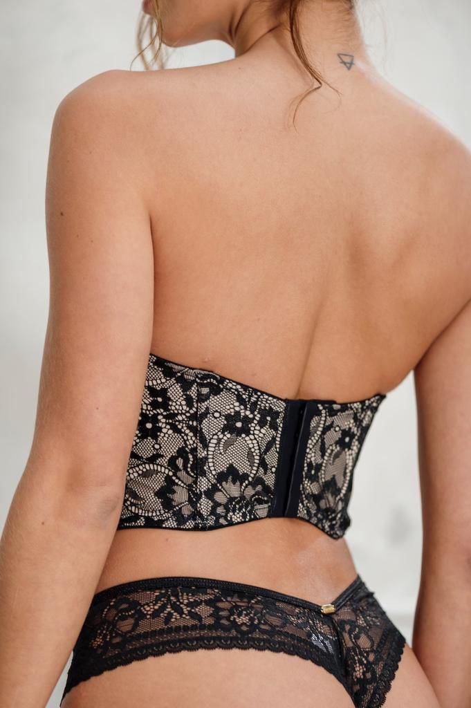 Top tipo bustier strapless con varillas de soporte, copas con realce suave y delicado diseño floral en encaje. Presenta detalle de amarre en la parte frontal con cinta satinada, que aporta un toque elegante y sofisticado.