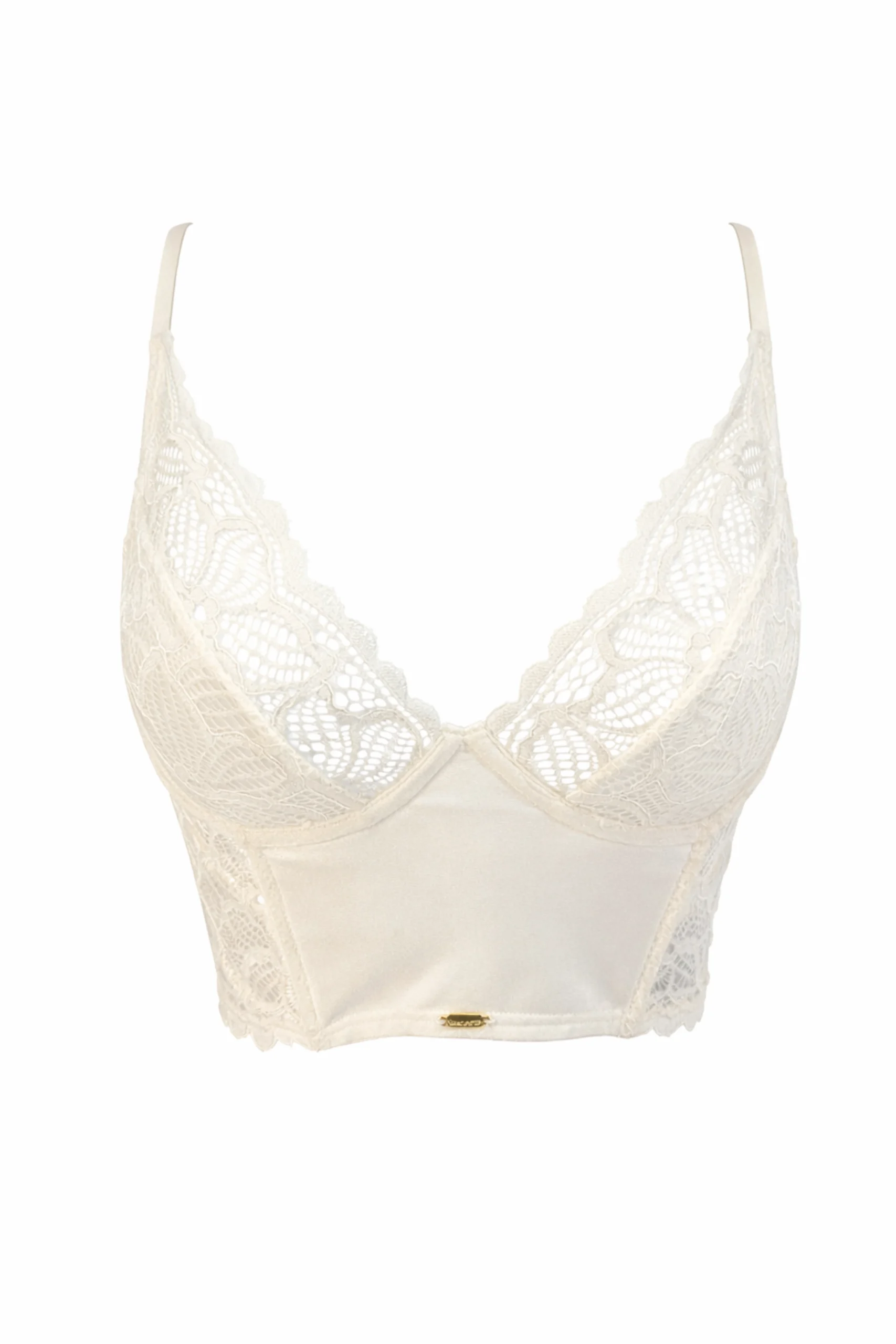 El brassier tipo bustier, elaborado en encaje floral, realza el busto con una silueta firme y femenina, mientras sus delicados detalles en la espalda aportan un toque moderno y sensual.
