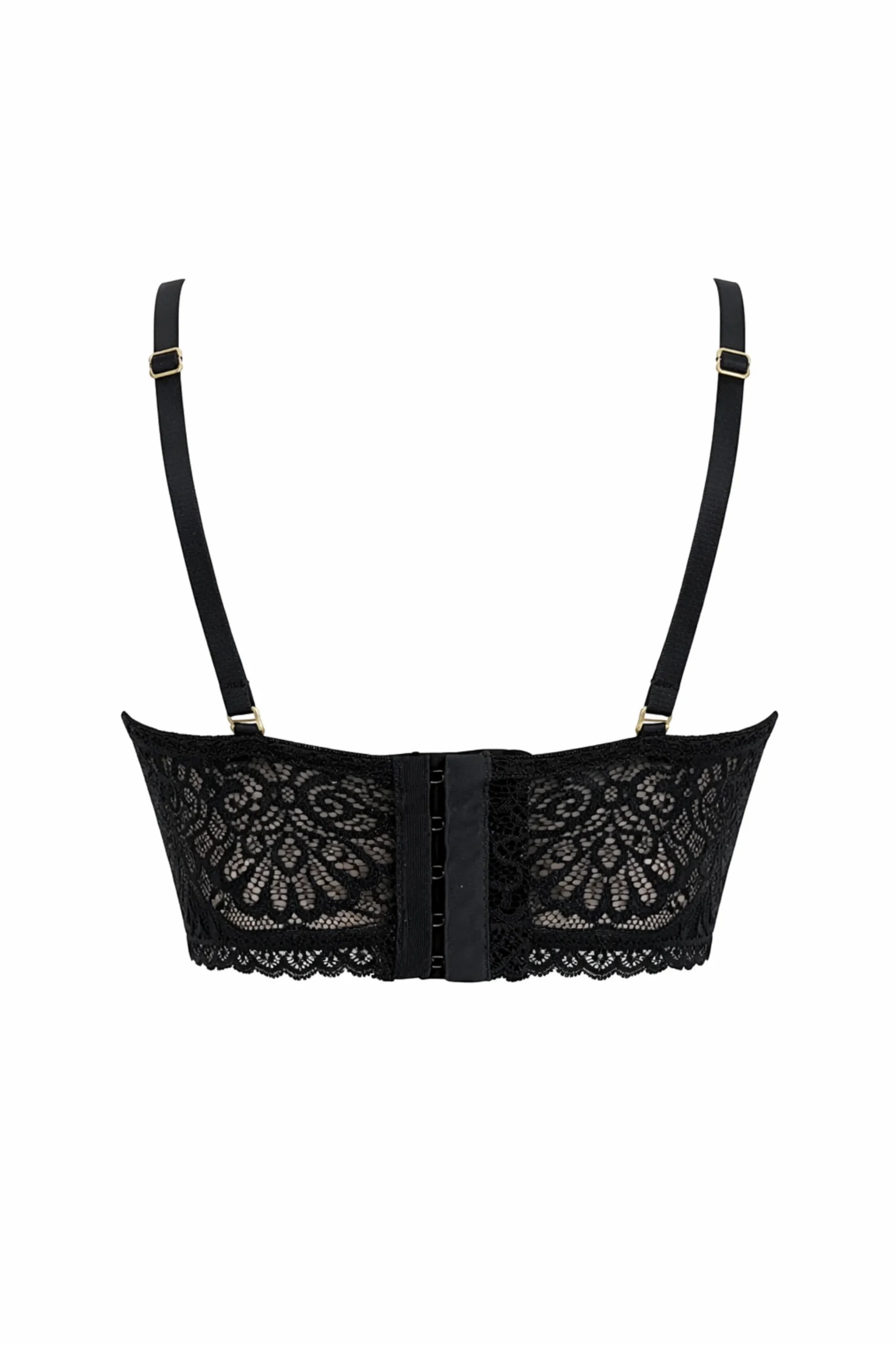• Bralette: de encaje delicado con detalles en transparencia y tiras decorativas en el escote, aportando un toque sensual y sofisticado. Su diseño tipo crop ofrece soporte ligero y un acabado moderno.